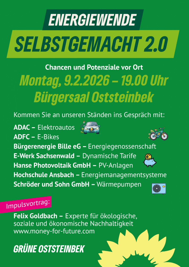 Die Grünen in Oststeinbek setzen am 9. Februar ihre Veranstaltungsreihe zur Energiewende fort. Von Elektroautos, -fahrrädern über dynamische Stromtarife bis zu Energiemanagementdystemen und PV-Anlagen für zuhause bieten wir Gespräche mit zahlreichen Expert*innen an. Kommt vorbei und schlendert bei Livemusik im Hintergrund im Bürgersaal an Messeständen vorbei und tauscht euch mit anderen Besucher*innen aus. Ihr seid herzlich eingeladen, der Eintritt ist frei.